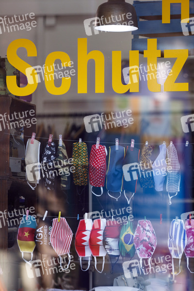 Die Stadt Nürnberg hat den Corona-Grenzwert von 50 überschritten. Damit gelten zahlreiche Maßnahmen für die Bürgerinnen und Bürger, die am Freitag vorgestellt wurden. Unter anderem gilt ab Samstag eine Maskenpflicht in der Innenstadt. Im Bild selbstgeschneiderte Stoffmasken im Schaufenster einer Schneiderei in Nürnberg. (Themenbild, Symbolbild) Nürnberg, 16.10.2020