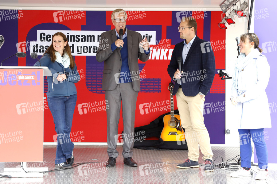 Janine Wissler, Dietmar Bartsch, Sebastian Lange und Olga Fot bei der Städtetour der Partei Die Linke zur Bundestagswahl 2021 mit dem Motto 'Sozial gerecht. Vor Ort. Jetzt!' auf dem Alten Markt. Stralsund, 28.08.2021