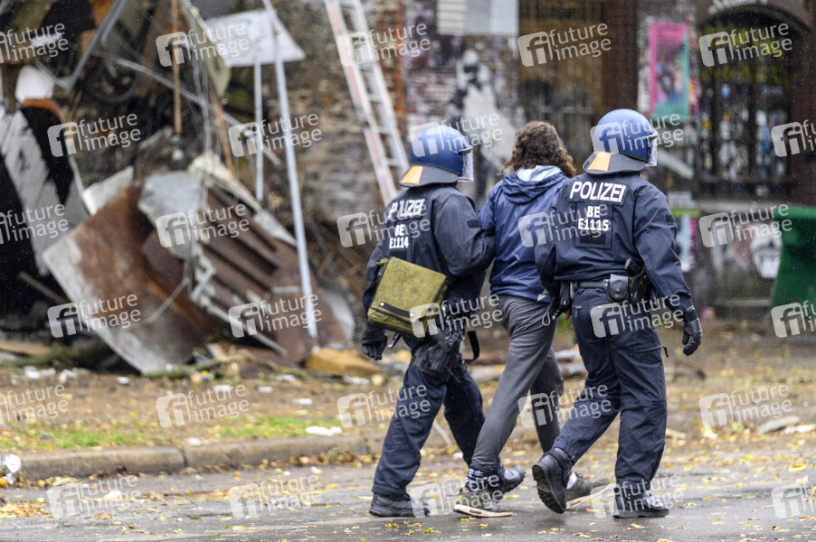 Räumung des linksautonomen Wagenplatzes 'Köpi'. Die Bewohner hatten im Vorfeld angekündigt, sie wollen nicht kampflos aufgeben. Rund eine Stunde haben die Barrikaden des linksautonomen Wagencamps gehalten, dann durchbrach die Polizei den Zaun an mehreren Stellen. Es gab Festnahmen. Berlin, 15.10.2021