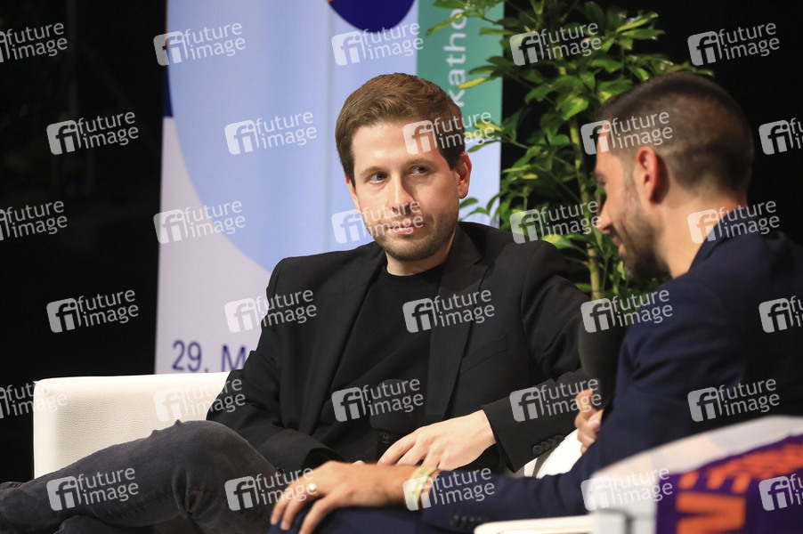 Kevin Kühnert und Marc Frings beim Podiumsgespräch auf dem 103. Deutschen Katholikentag in der Studiobox im Theater. Erfurt, 30.05.2024