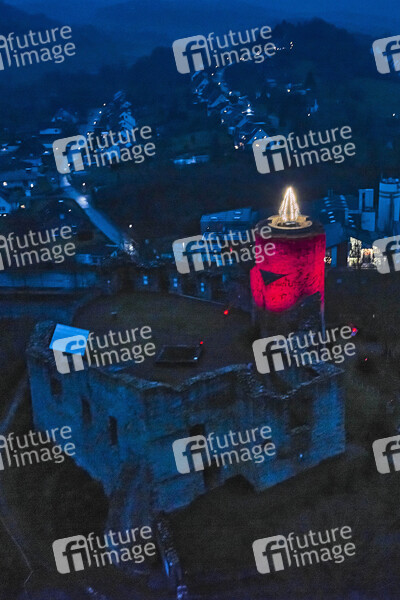 Advent, Adventszeit, Weihnachtszeit, Weihnachten, Christmas, X-Mas, Kerze, Riesenkerze, Weserbergland, Eversteiner Burg, Sehenswürdigkeit an der Weser, Ruine, Höhenburg, Luftaufnahme