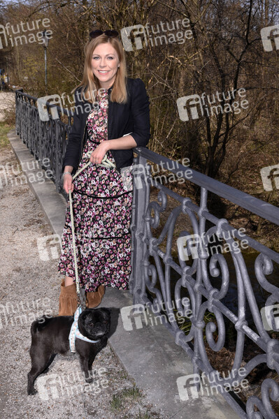Anna Ewelina beim Spaziergang mit Hund Resi am Kleinhesseloher See im Englischen Garten. München, 28. 03.2021