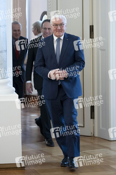 Jörg Kukies und Frank-Walter Steinmeier bei der Übergabe der Wohlfahrtsmarken 2025 durch den Bundesminister der Finanzen an den Bundespräsidenten im Schloss Bellevue. Berlin, 21.02.2025
