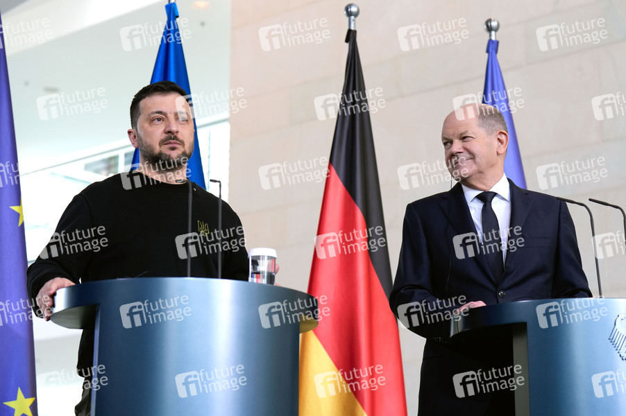 Wolodymyr Selenskyj und Olaf Scholz beim Empfang des Präsidenten der Ukraine zu einem gemeinsamen Gespräch mit dem Bundeskanzler und anschließendem Pressestatement im Bundeskanzleramt. Berlin, 16.02.2024