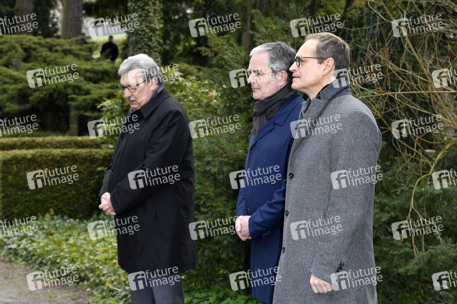 Ralf Wieland, Burkard Dregger und Michael Müller bei der Kranzniederlegung anlässlich des 100. Geburtstags des früheren Bundespräsidenten, Regierenden Bürgermeisters und Ehrenbürgers von Berlin, Richard von Weizsäcker an dessen Ehrengrab auf dem Waldfriedhof Dahlem. Berlin, 15.04.2020