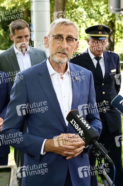 Der sächsische Innenminister Armin Schuster informiert sich über die Lage im grenznahen Raum und stellt die 'Fahndungsgruppe Grenze' vor auf dem Parkplatz vor der Stadtbrücke. Görlitz, 07.08.2025