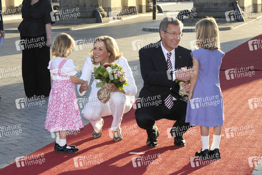 Christian Wulff und Gattin Bettina werden von den Kindern Marla Charlotte Badge (3 Jahre) und Sophia Julie Langner (4 Jahre) begrüßt