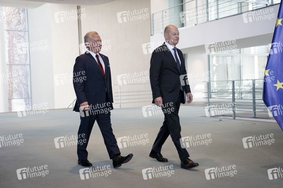 Abdullah II. bin al-Hussein und Olaf Scholz beim Empfang des Königs von Jordanien zu einem gemeinsamen Gespräch und anschließendem Pressestatement im Bundeskanzleramt. Berlin, 03.04.2025