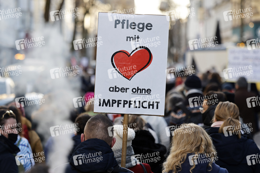 Bei einer angemeldeten Demo unter dem Motto 'Freie Impfentscheidung, Herr Lauterbach!' demonstrierten Tausende Gegner einer Impfpflicht mit einem Spaziergang gegen die Corona-Maßnahmen der Bundesregierung und für eine individuelle Impfentscheidung, Grundrechte und 'unversehrte' Kinder - darunter auch viele Pflegekräfte, die wegen der Impfpflicht im Gesundheitsbereich ihren Job zu verlieren drohen. Düsseldorf, 26.02.2022