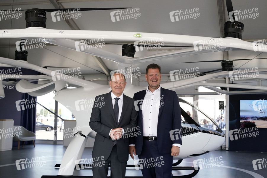 Olaf Scholz mit Stefan Klocke vor einem elektrischen Lufttaxi Volocity von Volocopter bei der ILA-Eröffnung mit anschließendem Rundgang auf dem ILA-Gelände am Flughafen BER Berlin-Brandenburg. Berlin, 22.06.2022