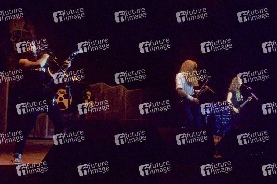 Marty Friedman, Dave Mustaine und David Ellefson von Megadeath live bei einem Konzert der 'Oxidation Of The Nations'-Tour im Hammersmith Odeon. London, 26.03.1991