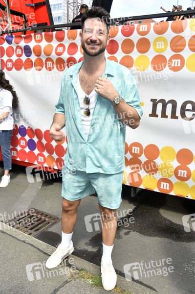 Alexander Schäfer vor dem M&M's Truck bei der 44. Christopher Street Day Parade 2022 unter dem Motto 'United in Love! Gegen Hass, Krieg und Diskriminierung' vom Spittelmarkt auf gut sieben Kilometern über Potsdamer Platz und Potsdamer Straße zum Nollendorfplatz, von dort weiter zur Siegessäule und zum Brandenburger Tor. Berlin, 23.07.2022