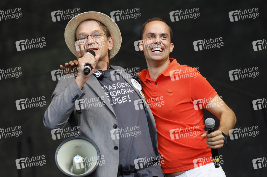 Bodo Schiffmann und Samuel Eckert - Demonstranten verschiedener Gruppierungen wie etwa der Initiative Querdenken 711 protestierten mit einer Großdemonstration in Berlin gegen die bestehenden Maßnahmen zur Eindämmung der Corona-Pandemie. Wegen Nichteinhaltung der polizeilichen Auflagen wurde die Demonstration durch die Polizei beendet. Es gab Rangeleien und Festnahmen. Berlin, 29.08.2020