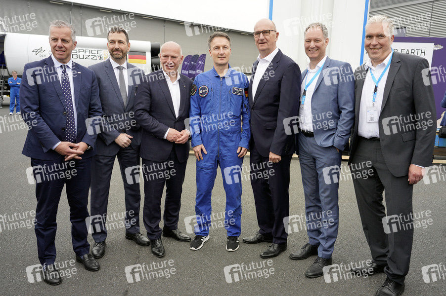 Kai Wegner, Matthias Maurer und Dietmar Woidke mit den ILA-Partnern beim Rundgang vor der Eröffnung der ILA Berlin auf dem ILA-Gelände am Flughafen BER Berlin-Brandenburg. Berlin, 03.06.2024