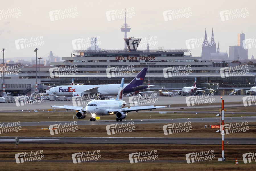 Das Hauptgebäude des Köln Bonn Airport im Abendlicht. Der Flughafen Köln/Bonn 'Konrad Adenauer' ist ein internationaler Verkehrsflughafen in Köln. (Themenbild, Symbolbild) Köln, 23.02.2022