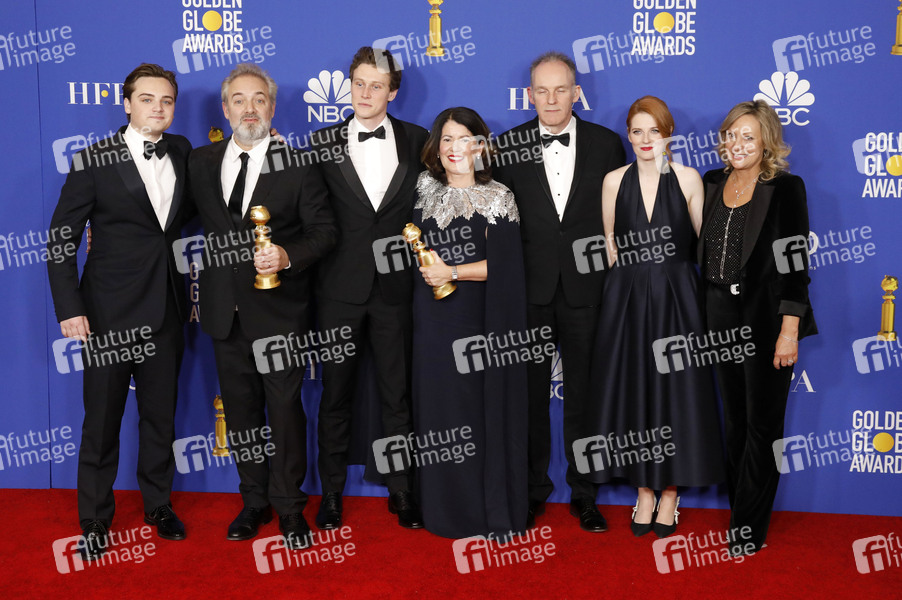 Dean-Charles Chapman, Sam Mendes, George MacKay, Pippa Harris und Krysty Wilson-Cairns mit dem Preis für den besten Film - Drama für '1917' bei der Verleihung der 77. Golden Globe Awards im Beverly Hilton Hotel. Beverly Hills, 05.01.2020