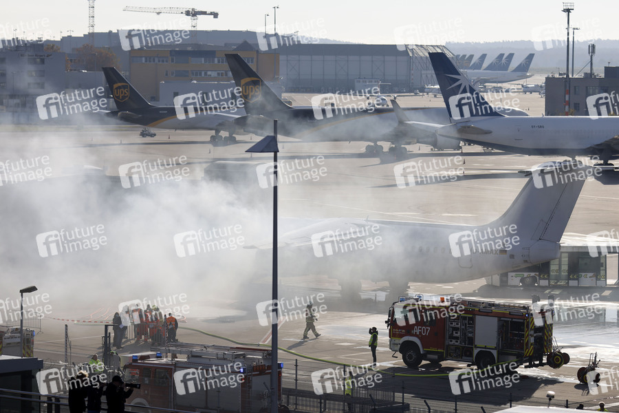 Einsatzkräftei der gemeinsamen ICAO-Notfallübung der Werkfeuerwehr, der Feuerwehr Köln, THW, Landespolizei, Bundespolizei und Bundeswehr am Köln Bonn Airport. Im Rahmen der Übung wird die Kollision eines Flugzeugs mit einem Passagierbus und einer Abfertigungshalle simuliert. Einsatzkräfte retten Verletzte aus dem in Brand geratenen Flugzeug. Köln, 06.11.2021