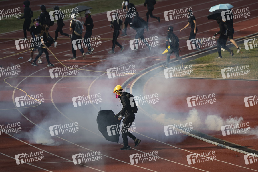 Tränengas-Einsatz auf dem Sportplatz der Universität - Kampf an der Chinese University Hong Kong (CUHK). Hongkong protestiert seit fünf Monaten ununterbrochen. Am Montag, dem 11. November 2019, begann ein Streik in der ganzen Stadt, der Teile von Hongkong zum Erliegen brachte, als MTR-Stationen geschlossen und mehrere Straßensperren errichtet wurden. Hongkong, 12.11.2019