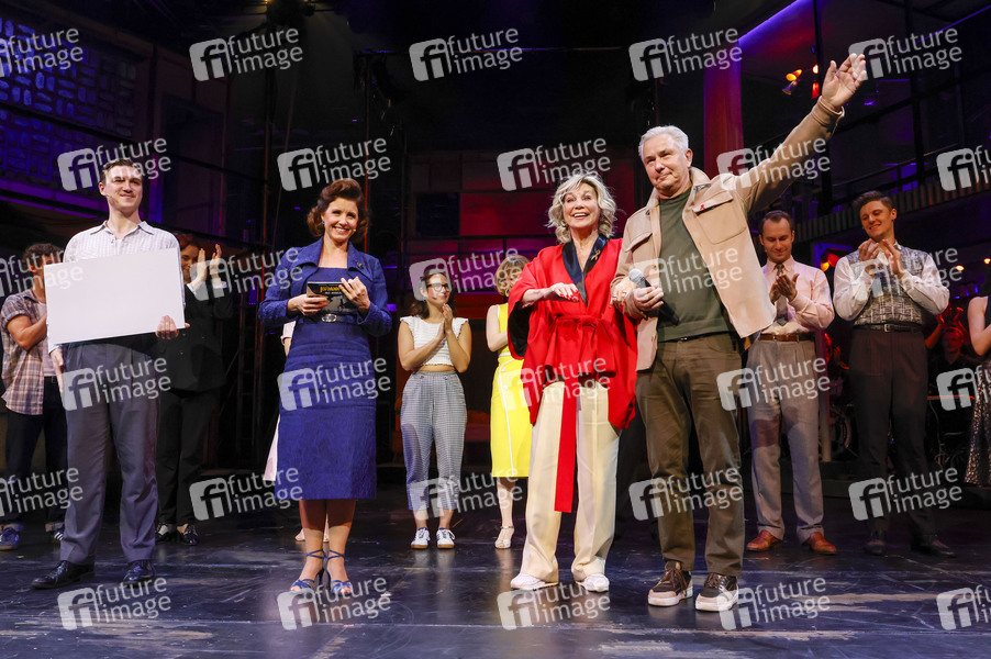 Judy Winter und Klaus Wowereit mit dem Ensemble des Musicals 'Ku'damm 59' bei der Spendenscheckübergabe zum Welt-Aids-Tag 2024 im Theater des Westens. Berlin, 30.11.2024