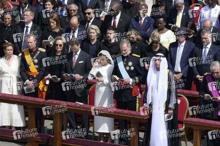 Großherzogin Maria Teresa von Luxemburg, Großherzog Henri von Luxemburg, Prinzessin Sophie von Liechtenstein, Erbprinz Alois Philipp Maria von und zu Liechtenstein, Königin Letizia von Spanien, König Felipe VI. von Spanien und Sheikh Saud bin Saqr al Qasimi bei der Amtseinführung von Papst Leo XIV. auf dem Petersplatz.Vatikanstadt, 18.05.2025