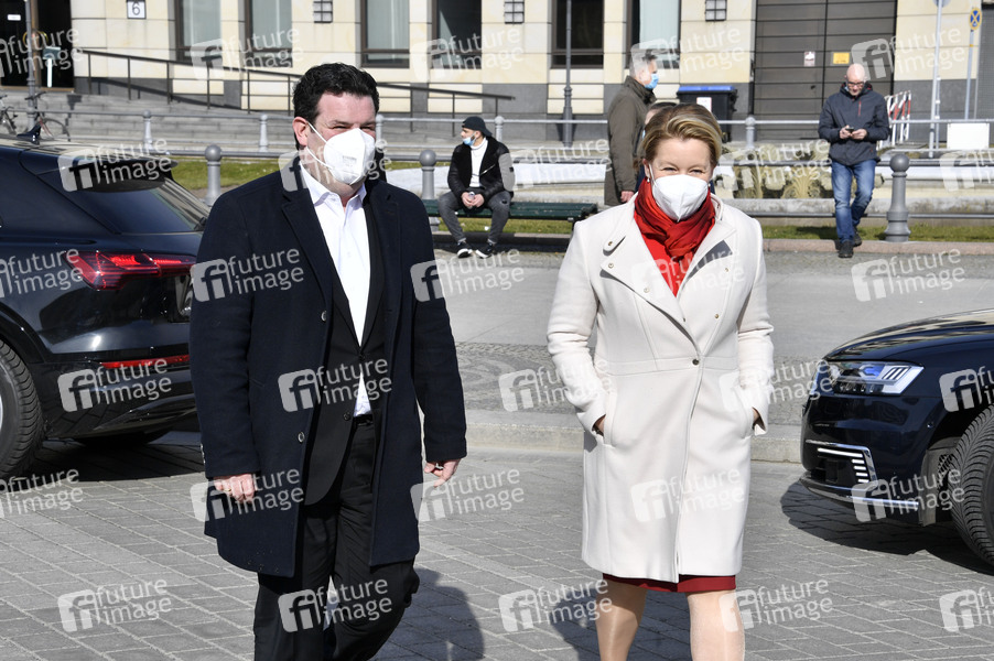 Hubertus Heil und Franziska Giffey bei der DGB-Aktion zum Equal Pay Day vor dem Brandenburger Tor. Berlin, 10.03.2021