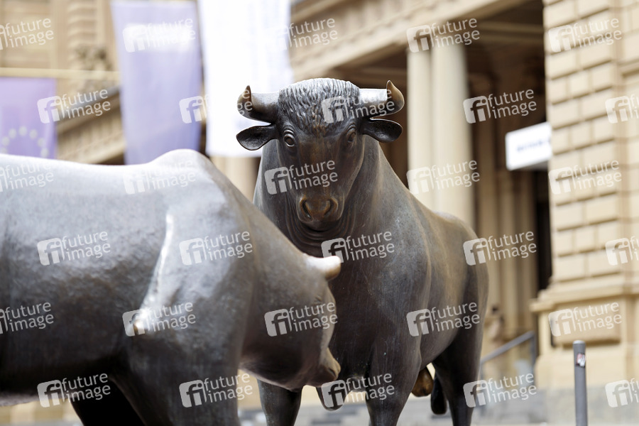 Bulle und Bär vor der Frankfurter Wertpapierbörse. Die Deutsche Börse hat im dritten Quartal unter anderem von den Turbulenzen am Strommarkt profitiert. Zudem zahlten sich zuletzt getätigte Übernahmen weiter aus. (Themenbild, Symbolbild) Frankfurt, 15.10.2021