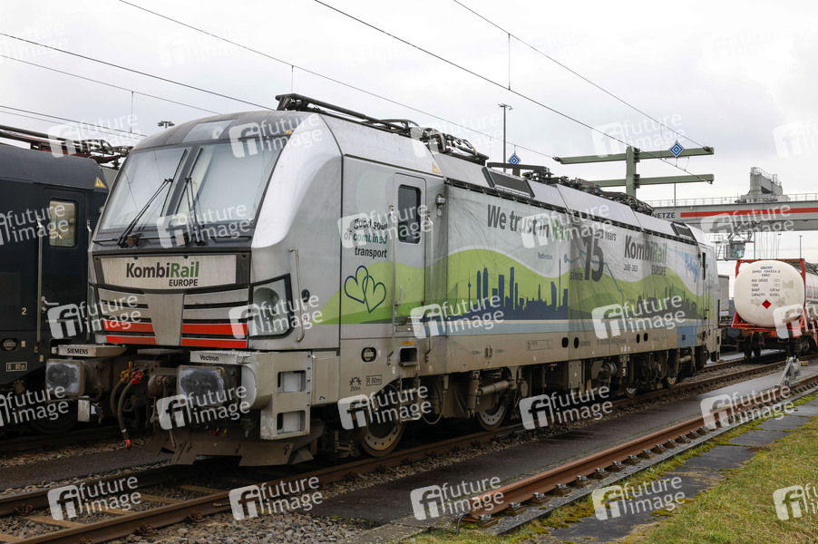 Siemens Vectron-Lok beim Fototermin 'DB montiert 400 Tonnen schwere neue Krananlage' im DUSS-Terminal Köln-Eifeltor. Köln, 23.01.2025