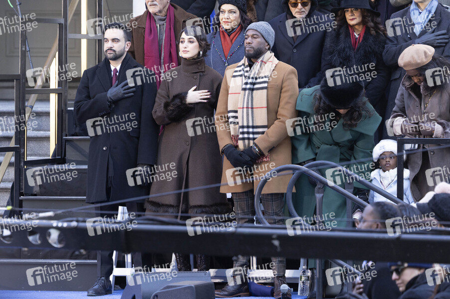 Zohran Mamdani mit Ehefrau Rama Duwaji und Jumaane Williams mit Begleitung bei der Amtseinführung von Zohran Mamdani zum ersten muslimischen Bürgermeister von New York City in Rathaus. New York, 01.01.2026