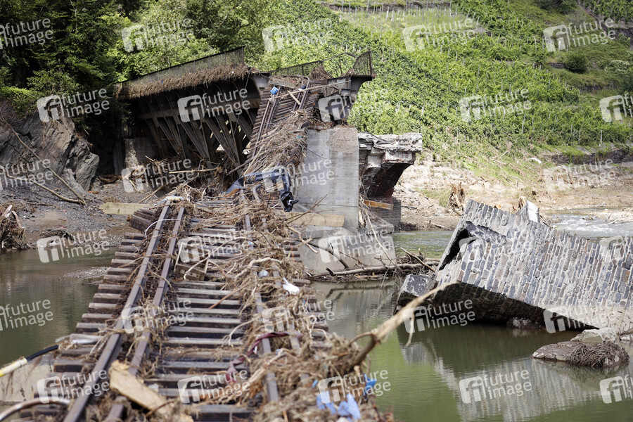 Nach dem Jahrhunderthochwasser in der Eifel durch heftige Regenfälle und Dauerregen mit Überschwemmungen und Überflutungen haben die Aufräumarbeiten im Ahrtal große Fortschritte gemacht. Einheiten von Polizei, THW, Bundeswehr und Feuerwehr mitsamt vielen freiwilligen Helfern haben Straßen geräumt, Schutt und Schlamm entfernt und die Menschen versorgt. Der Wiederaufbau wird trotzdem Jahre dauern. Im Bild Flutschäden an einer Eisenbahnbrücke nahe der Ortschaft Rech, in der die Flut viele Häuser zerstörte, 30.07.2021