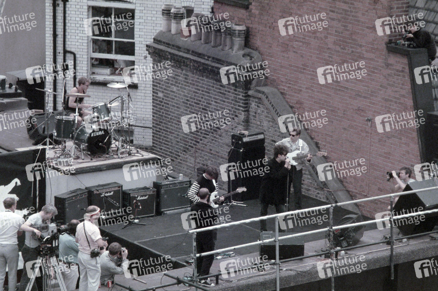 Pete de Freitas, Will Sergeant, Ian McCulloch und Les Pattinson von Echo & the Bunnymen live bei einem Rooftop-Konzert zum 20 jährigen Jubiläum des Beatles-Albums 'Sgt. Pepper’s Lonely Hearts Club Band' auf dem Dach vom HMV Record Store in der Oxford Street. London, 06.07.1987