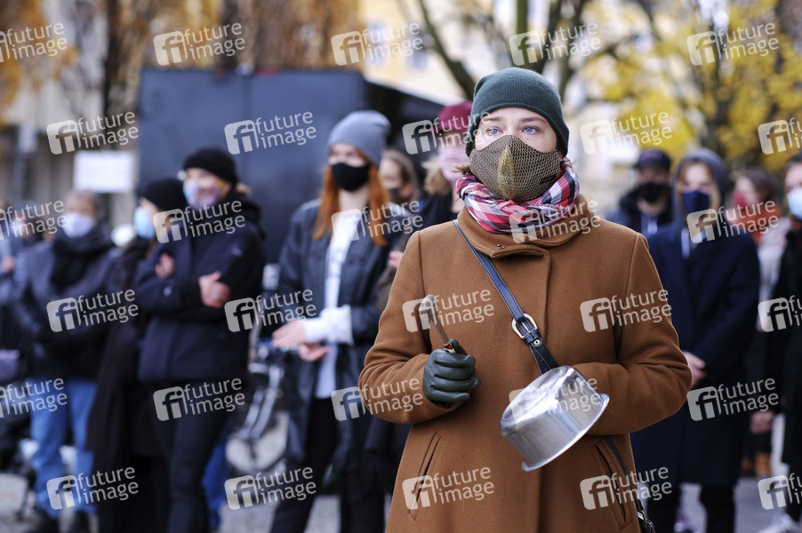 Linke Gruppen protestieren gegen eine Demonstration von Corona-Leugnern und Impfgegnern aus der Querdenken-Bewegung gegen die aktuellen Corona-Maßnahmen unter dem Motto 'Schweigemarsch gegen Diskriminierung und für Menschenrechte'. Der Demonstrationszug zieht durch den Berliner Stadtteil Prenzlauer zum Alexanderplatz. Berlin, 22.11.2020