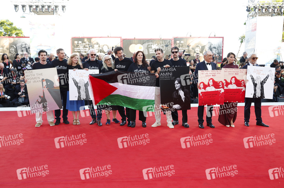 Roberto Cicutto, Caterina Murino, Alberto Barbera, Santiago Mitre, Andrea Pallaoro, Laura Poitras, Saleh Bakri, Jane Campion, Martin McDonagh, Mia Hansen-Love, Gabriele Mainetti und Damien Chazelle nehmen Flashmob aus Solidarität mit dem iranischen Volk nach der Verurteilung von Saeed Roustaee teil, vor der Premiere des Kinofilms 'Maestro' auf der Biennale di Venezia 2023 / 80. Internationale Filmfestspiele von Venedig im Palazzo del Cinema. Venedig, 02.09.2023