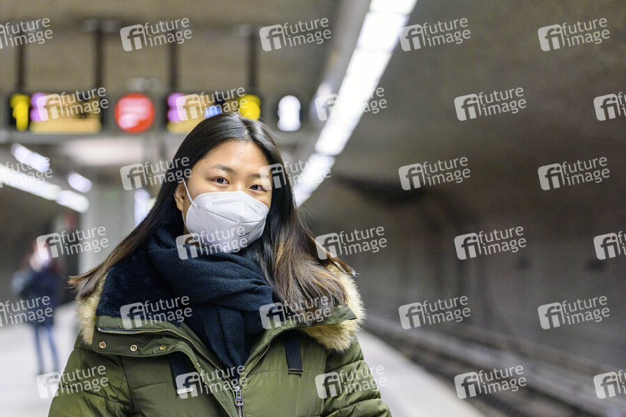 Die FFP2-Maskenpflicht gilt für öffentliche Nahverkehrsmittel wie Busse und Bahnen (einschließlich Bahnhöfe und Haltestellen) sowie für den Einzelhandel in Bayern. Im Bild U-Bahn Haltestelle Schoppershof (Symbolbild, Themenbild, Model Release) Nürnberg, 14.01.2021