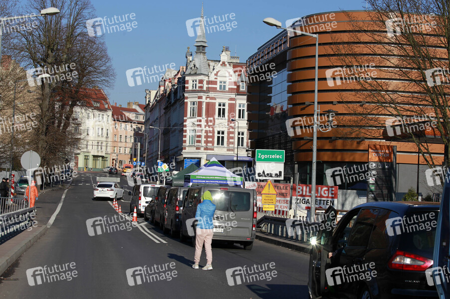 Strenge Corona-Kontrollen und lange Wartezeiten am Grenzübergang Stadtbrücke von Görlitz nach Zgorzelec. Görlitz, 01.04.2020