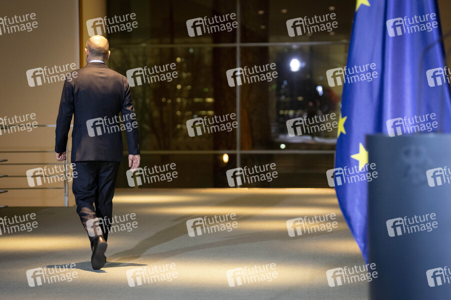 Olaf Scholz bei einem Pressestatement im Bundeskanzleramt, nachdem ein afghanischer Asylbewerber in München in eine Menschenmenge gefahren ist und viele Menschen verletzt hat. Berlin, 13.02.2025