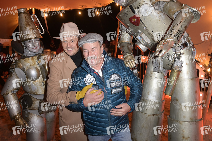 Claudia Jungesbluth, Roman Knizka und Till Demtroeder beim offiziellen Opening der Baltic Lights 2024 mit Fackellauf und Lagerfeuer an der Alex Strandbar. Heringsdorf, 01.03.2024