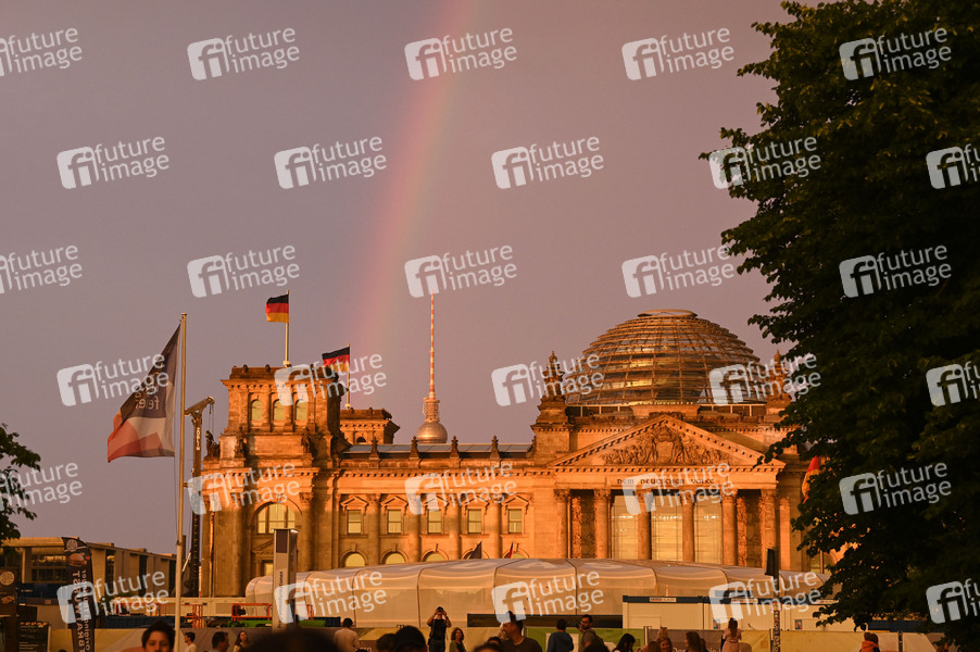 Regenbogen über dem Reichstagsgebäude beim Konzert von Glasperlenspiel auf dem Demokratiefest zu 75 Jahren Grundgesetz auf der 360-Grad-Bühne zwischen Kanzleramt und dem Deutschen Bundestag. Berlin, 24.05.2024