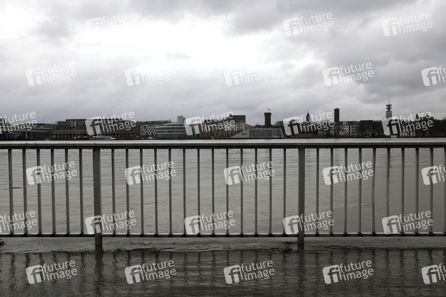 Reinhochwasser, Rheinpegel, Fluss, Rhein, Pegelstand, Pegel, Hochwasser, Pegelmarke, Hochwassermarke, Hochwasserwelle, Scheitelpunkt, Rhein-Pegel, Flussbett, Flut, Schifffahrt, Hochwasserschutz, Wasserstand, Mittelwasser, Tauwetter, Rheinschifffahrt, Rheinufer, Rhein-Ufer, Hochwasserschutzzentrale, Hochwasserwelle, Pegel-Nullpunkt, Hochwasserlage, Hochwassermeldedienst, Hochwasserinformationsdienst, Wasserstände, Pegelstände, Wetterlage, ansteigendes Wasser, steigender Pegel, unter Wasser, überflutet, Rheinufer, Schmelzwasser, Wetter, Scheitelpunkt, kritische Marke, Hochwassermarke, Deutz, Symbolbild, Symbolfoto