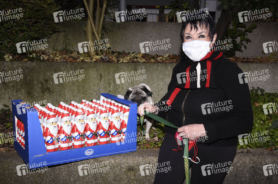 Uschi Ackermann (mit Hund Willy) spendet 700 Schokoladennikoläuse an das Dr. von Haunersche Kinderspital. München, 16.12.2020