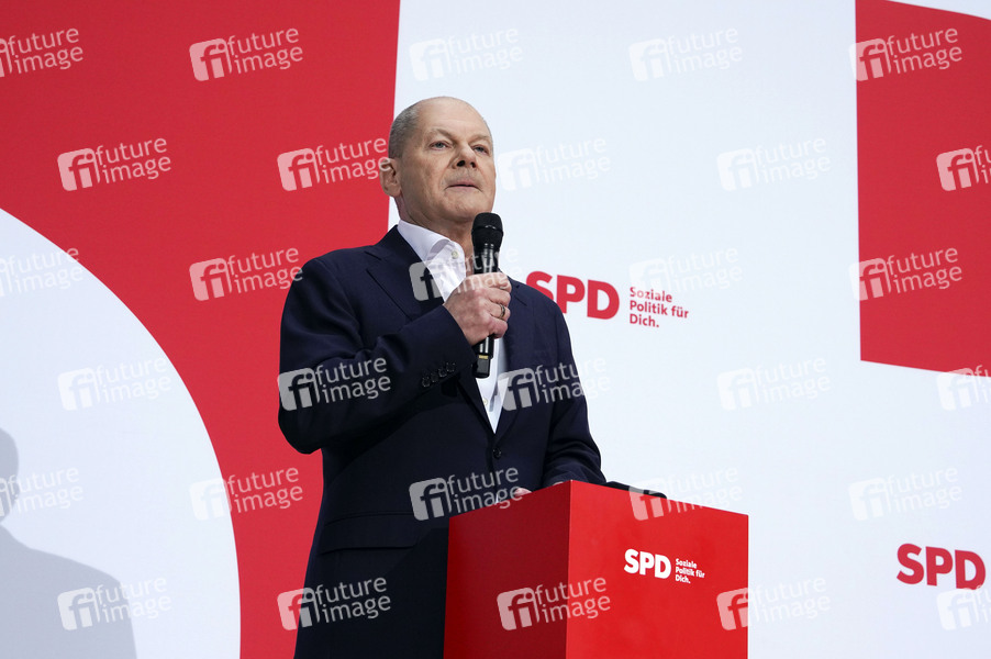 Olaf Scholz bei der Pressekonferenz der SPD nach den Gremiensitzungen zur Beratung aktueller Themen und der Nominierung des SPD-Kanzlerkandidaten für die Bundestagswahl im Atrium vom Willy-Brandt-Haus. Berlin, 25.11.2024