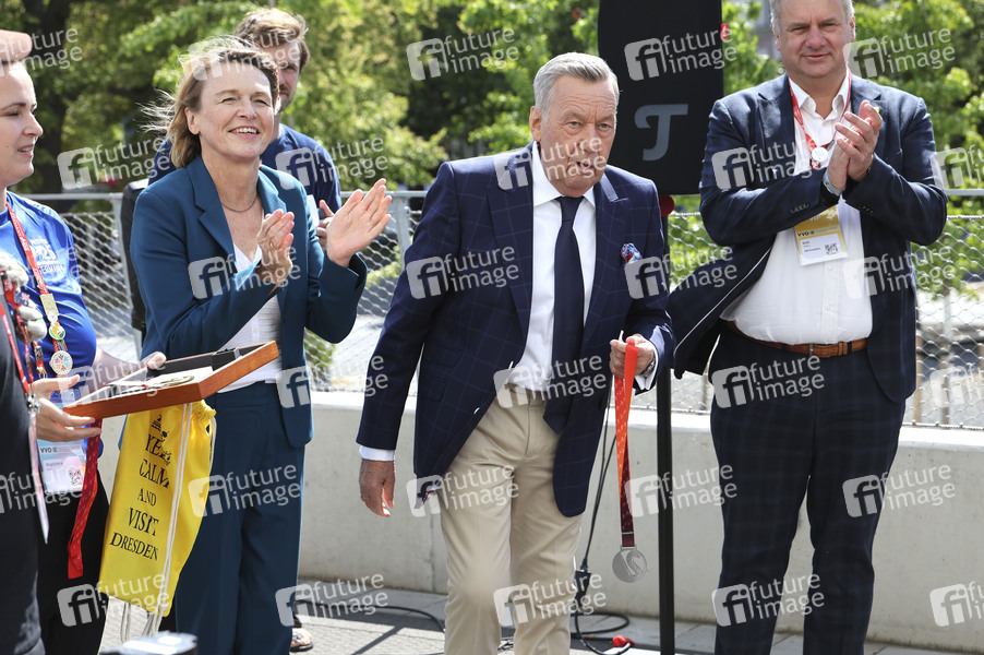 Elke Büdenbender, Roland Kaiser und Dirk Hilbert bei der Abschlussveranstaltung der 25. World Transplant Games 2025 im Heinz-Steyer-Stadion. Dresden, 23.08.2025