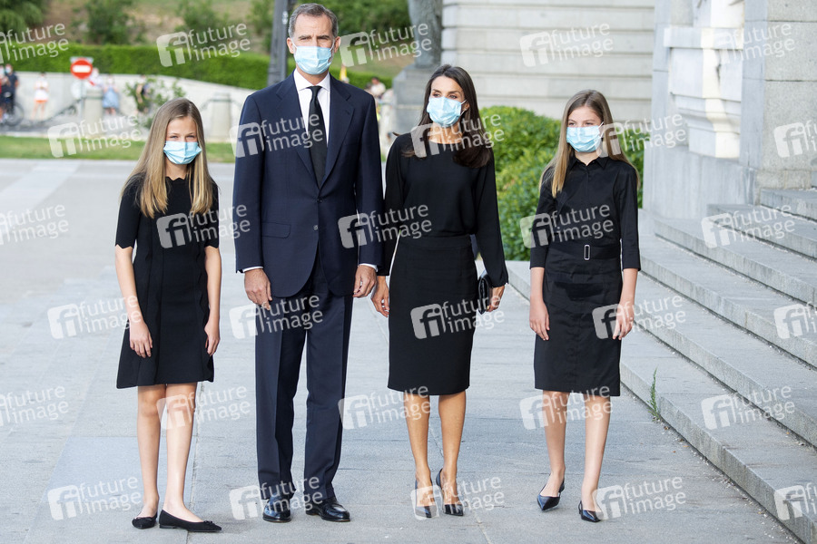 Prinzessin Leonor von Spanien, König Felipe VI. von Spanien, Königin Letizia von Spanien und Prinzessin Sofia von Spanien bei einer Gedenkmesse für die Opfer des Coronavirus COVI-19 in der Almudena-Kathedrale. Madrid, 06.07.2020