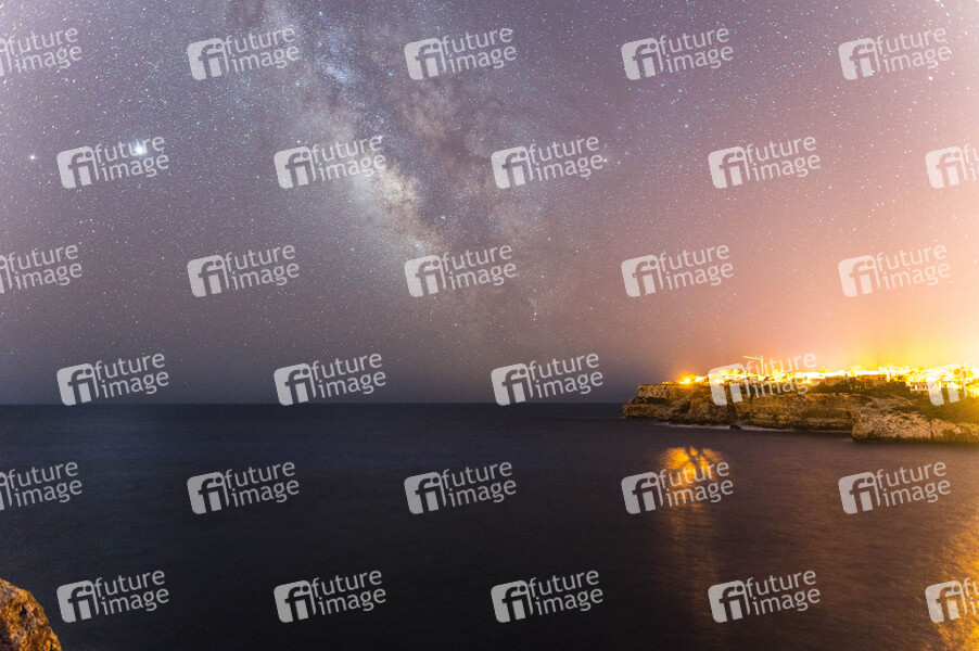 Die Milchstraße über dem Cap Formentor. Das Milchstraßensystem besteht aus etwa 100 bis 300 Milliarden Sternen und großen Mengen interstellarer und Dunkler Materie. Mallorca, 20.07.2020