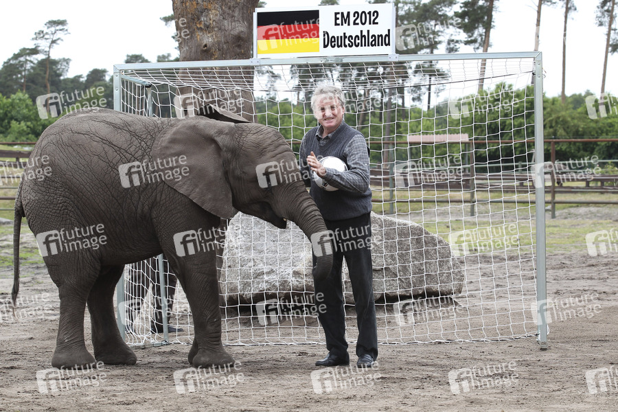 Start der Fan Fun Runde mit Elefantendame Nelly im Serengeti-Park, Hodenhagen. Gemeinsam mit Sepp Maier tippte Sie heute für das erste Spiel der deutschen Fußballnationalmannschaft gegen Portugal