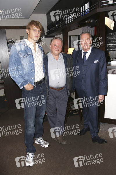 Merlin Rose, Axel Prahl und Roland Kaiser beim Fototermin am Set des ARD-Films 'Eisland' im Restaurant Adria. Hamburg, 02.09.2019