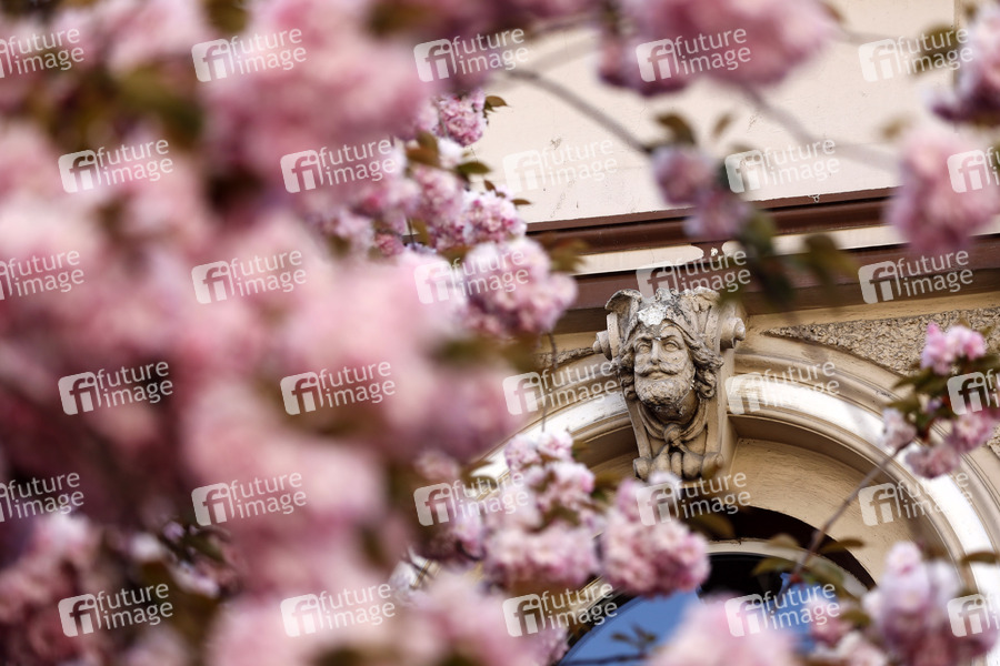 Passanten, Anwohner und Touristen bewundern die alljährliche Bonner Kirschblüte in der Bonner Altstadt rund um die Heerstraße. In diesem Jahr darf das Naturschauspiel nur unter Einhaltung strenger Corona-Maßnahmen beobachtet werden. Ordnungsamt und Polizei kontrollieren die Einhaltung von Maskenpflicht und Mindestabstand in den Gassen. Wenn der Andrang zu groß wird, sollen einzelne Straßen auch gesperrt werden. Bonn, 22.04.2021