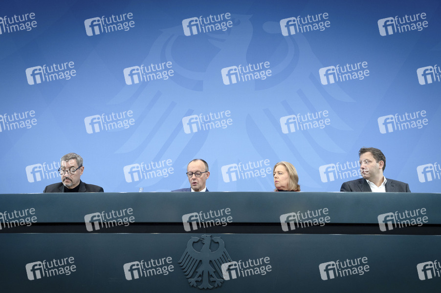 Markus Söder, Friedrich Merz, Bärbel Bas und Lars Klingbeil bei einer Pressekonferenz nach der Sitzung des Koalitionsausschusses von Union und SPD im Kanzleramt. Berlin, 11.12.2025
