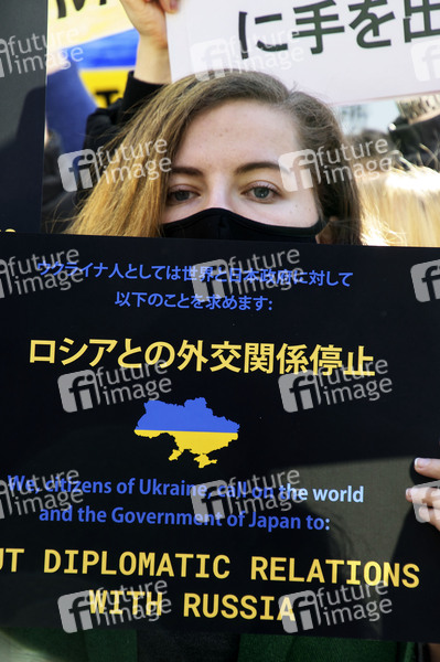 Solidaritätsaktion, Solidarität, Ukraine, Russland, Ukrainekonflikt, Politik, Solidaritätsbekundung, Krise, Konflikt, Demo, Demonstranten, Protest, Kriegsgegner, Einmarsch, Angriff, Krieg, Invasion, internationale Krise, Tokyo