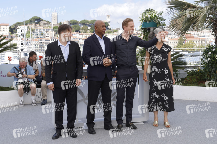 Aleksey Aygi / Alexei Aigui, Raoul Peck, Damian Lewis und Alexandra Strauss beim Photocall zum Dokumentarfilm 'Orwell' auf dem Festival de Cannes 2025 / 78. Internationale Filmfestspiele von Cannes am Palais des Festivals. Cannes, 18.05.2025