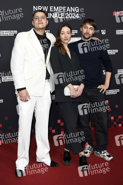 Youness Aabbaz, Aenne Schwarz und Michael Fetter Nathansky beim 21. NRW Empfang des Landes NRW und der Film- und Medienstiftung NRW im Rahmen der Berlinale 2024 in der Vertretung des Landes Nordrhein-Westfalen. Berlin, 18.02.2024